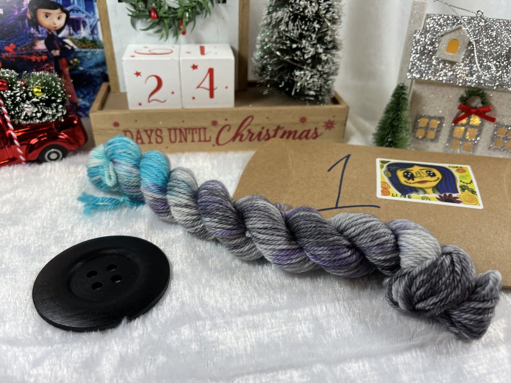I’ll be honest – I’ve never seen Coraline. I have no idea what it’s about. But I know a few things: (1) I’ve always been very happy with anything that’s been created by Yarn Baby; (2) I love the blue-to-purple fade of the inspiration image; and (3) I love Advent calendars. So when I saw on social media that Yarn Baby had some extra Advent calendars available, I decided to give this one a shot.