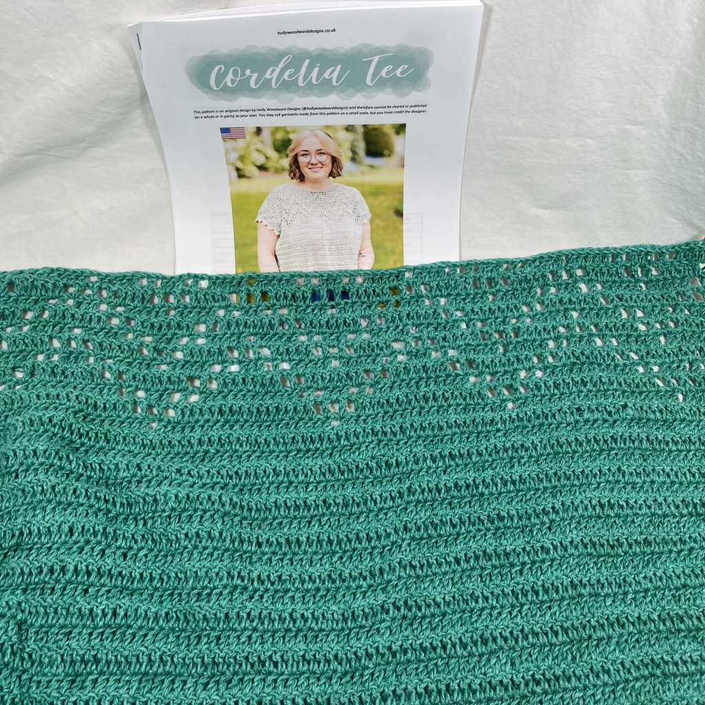 The Cordelia Tee is a crochet pattern by Holly Woodward Designs. It is a boxy tee that is worked in two panels from the bottom up with filet crochet detailing near the neckline on both the front & back and on the shoulders. It is designed to use DK weight cotton yarn, so that makes it breathable and hopefully perfect for the climate here in Florida.
