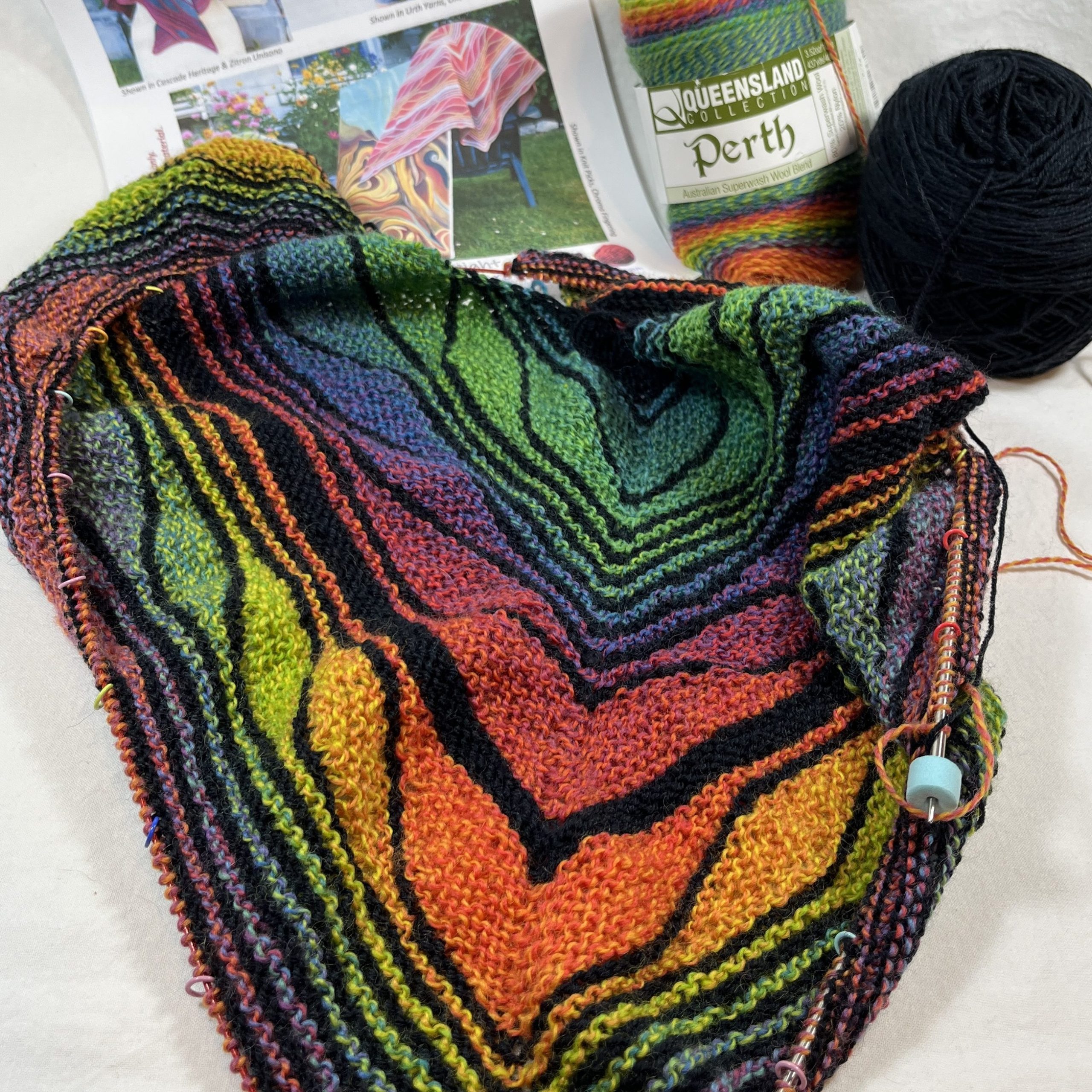 After I made it through the first of the three main sections of the pattern, I was enjoying working on it but realized that I wasn’t in love with my yarn choice. I loved the Disco Chicken, but I wasn’t getting the stained glass effect that I’d fallen in love with when I first saw the Papillon. So I put it to the side and ordered some new yarn for it. This time, I chose a yarn with long color transitions, which is something mentioned in the pattern. I got Queensland Collection Perth yarn in the Rainbow Reef colorway for the primary yarn, and Cascade Yarns Heritage in Real Black for the contrast. And there was the stained glass effect I wanted.